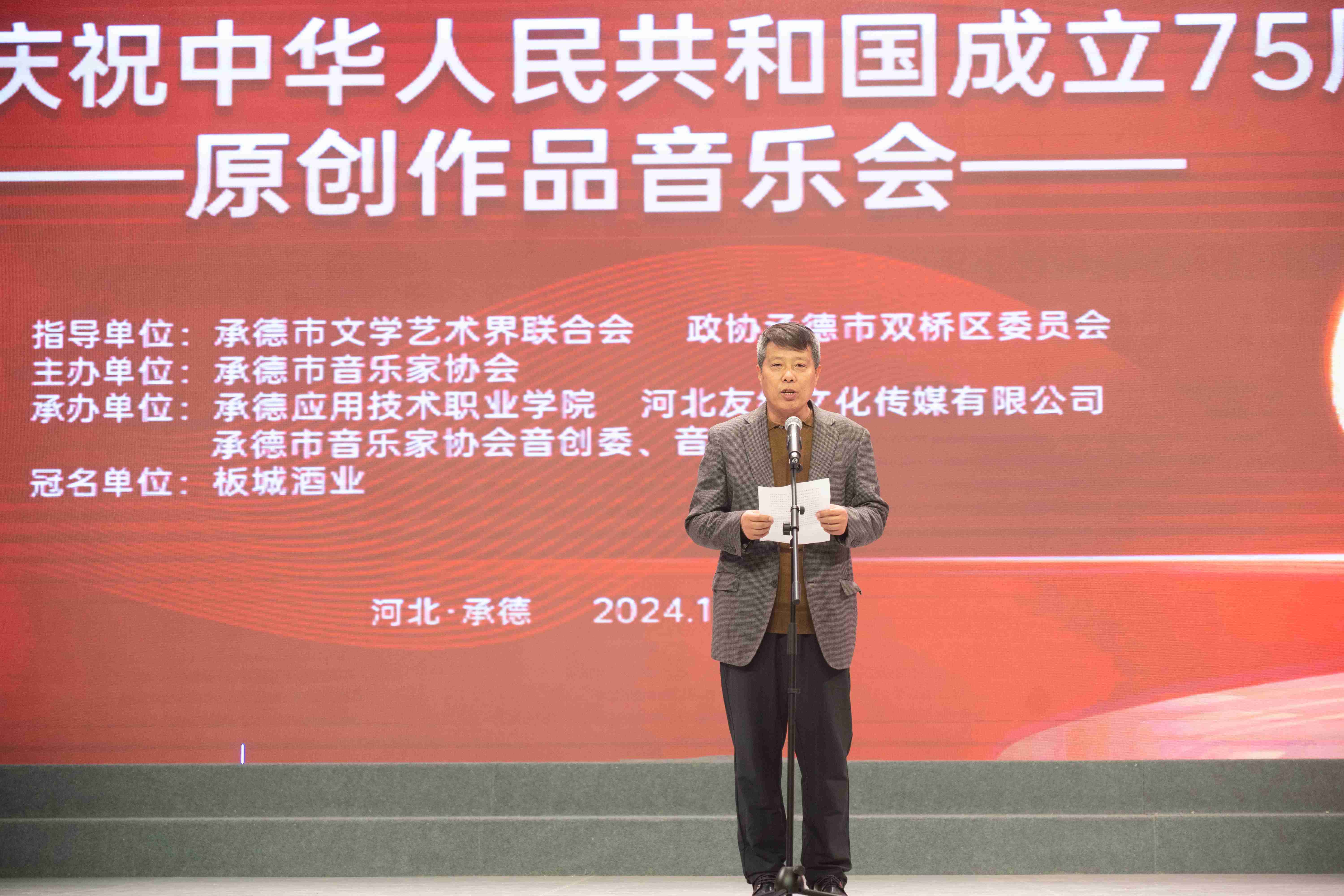 謳歌新時(shí)代、禮贊新中國(guó);10月23日,為慶祝中華人民共和國(guó)75周年華誕,板城酒業(yè)聯(lián)合承德市音樂(lè)家協(xié)會(huì)舉辦“太平豐年、龍印鑒證——承德市慶祝中華人民共和國(guó)成立75周年原創(chuàng)作品音樂(lè)會(huì)”,用音樂(lè)歌頌偉大的祖國(guó)和偉大的黨。