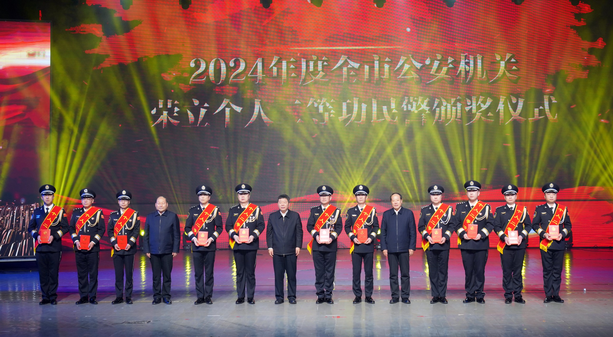 市委副書記、市長王亞軍,市人大常委會主任劉文勤,市政協(xié)主席吳清海,為榮立個人二等功民警頒獎